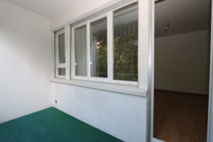 Espace de vie : Une pièce principale avec parquet, murs blancs et accès direct au balcon.